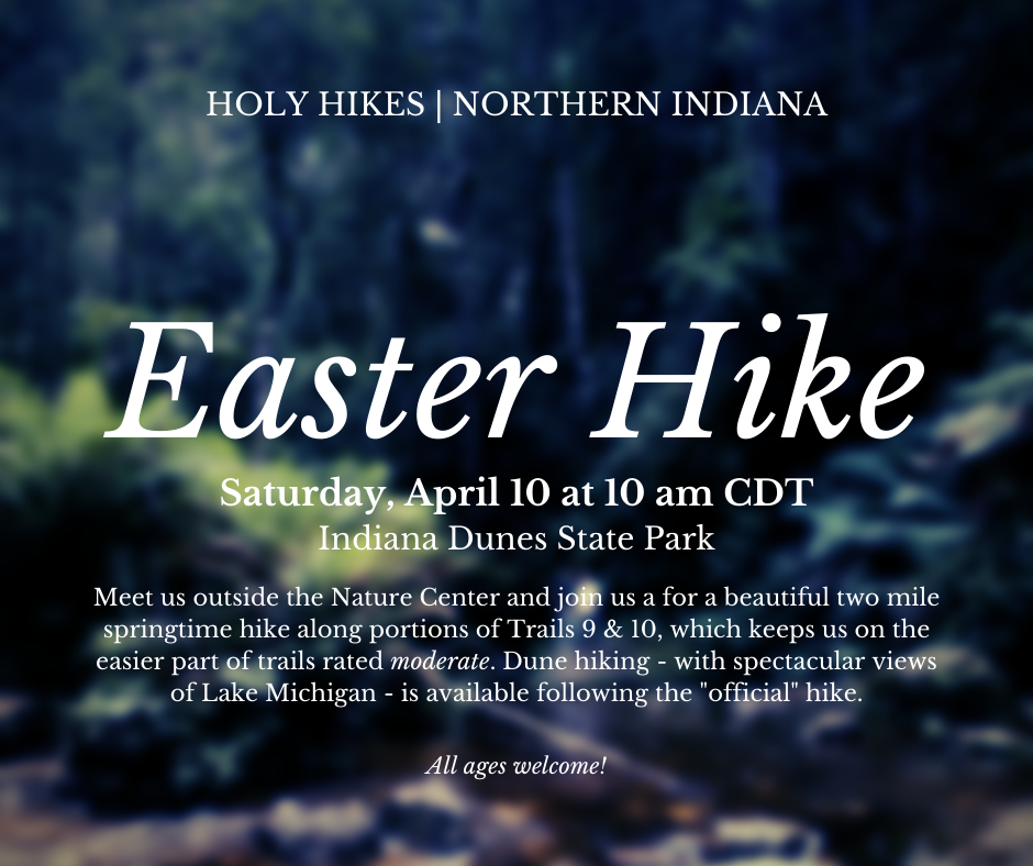 Holy Hikes: Northern Indiana heads to the dunes on Saturday, April 10 for an Easter Hike. Meet us outside the Nature Center at 11/10 a.m. (EDT/CDT). We'll practice prayer and mindfulness as we walk amid the waking earth. We'll hike about 2 miles along sections of Trails 9 and 10, which will keep us on the easier parts of trails rated "moderate." Dune hiking - with spectacular views of Lake Michigan - is available and encouraged for those up to the challenge following our "official" hike.